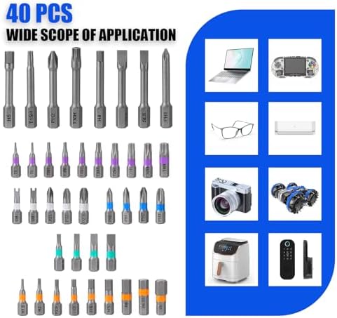 Comprehensive kit: The 40 piece screwdriver head kit includes S2 steel screwdriver heads of various sizes, including Phillips, Torx, Hex, Slotted, etc., suitable for various tasks such as home, DIY, bicycle repair, and professional repair.