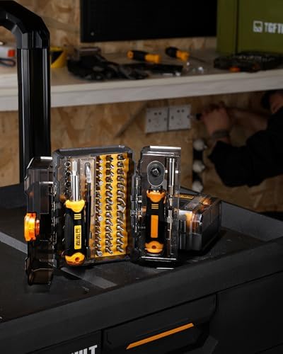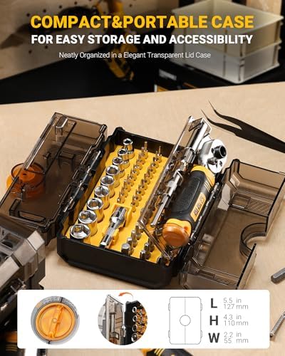 [Double-Layer Transparent Cover Storage Case& Compact Organized] The well-designed storage case features two neatly arranged layers. The ratchet wrench and screwdriver handle are on the upper layer, and the sockets and bits are on the lower layer. The transparent cover allows for quick identification. The ratchet screwdriver set is placed in categories and has corresponding positions to be stuck, making the case more organized. No need to worry about not finding what you need.