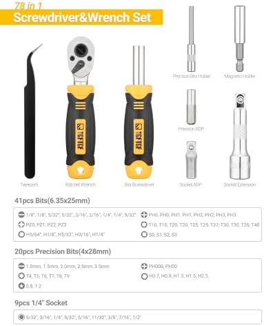 [78 PCS Ratchet Wrench Screwdriver Bit Set to Meet Heavy Duty & Precision Work] Including 1/4-inch hexagonal screwdriver, 1/4-inch double-sided hexagonal ratchet wrench, 70 commonly used screwdriver bits and sockets, as well as precision bit holder, magnetic holder, extension bar, 25mm adapter (placed next to the bit), precision bit adapter, tweezers. Everything you need for repair, assembly and maintenance at home, in the garage. Not only for heavy duty work but also for precision work.