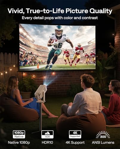 4K Supported | Native 1080P with HDR10: Featuring native 1080P Full HD resolution with HDR10 for vivid contrast and 300 ANSI Lumens of brightness, this 4K projector performs best in dim or moderately lit environments. (Note: 4K input requires HDMI-connected devices like a Fire TV Stick)