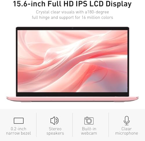 Display: 15.6″ Full HD (1920 × 1080) IPS screen with a 0.2 in narrow bezel and 180° hinge; powered by UHD Graphics (16 EU at up to 1.20 GHz) supporting up to three 4K @ 60 Hz external displays for vibrant visuals and flexible viewing angles