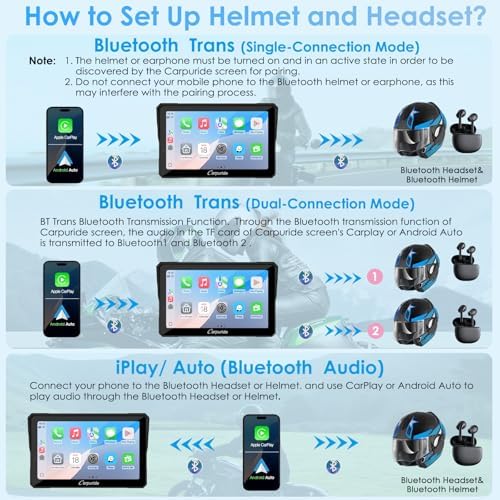 【Single & Dual Connection Modes】In BT Trans mode, the W702S Pro CarPlay supports both single and dual connections, allowing you to pair Bluetooth headsets or helmets with ease, whether for solo use or sharing with a passenger. In CarPlay or Android Auto mode, only single connection is supported, enabling audio transmission from your smartphone to a helmet or headset for hands-free communication and music playback.