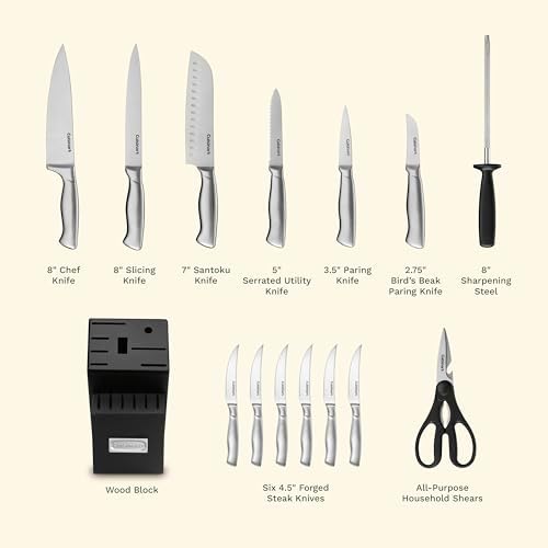 COMPREHENSIVE SET: The kitchen knife set includes an 8” chef knife, 8” slicing knife, 7” santoku knife, 5.5” serrated utility knife, 3.5” paring knife, 3.5” bird’s beak paring knife, 4.5” steak knives (6), 8” sharpening steel, shears, and a wood block.
