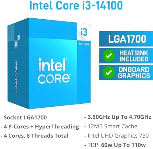 Processor: Intel Core i3-14100, 4 cores, 4 threads, 3.5GHz base frequency, 4.7GHz max turbo frequency