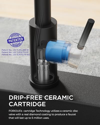 Newest Faucet Set — The FORIOUS kitchen faucet set includes a 14.76 inch faucet and an 11.83 oz (350 ml) soap dispenser. The versatile dispenser is ideal for hand soap, dish soap and more. This set is designed to meet your kitchen needs perfectly