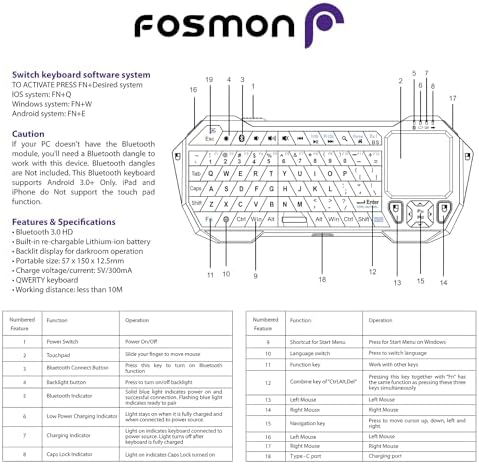 Layout QWERTY Bluetooth Bluetooth 3.0 Working Distance 33ft Charging Time Approx.2-2.5 hours Standby Time Approx.50 days Continuous Working Time Approx.10 days Charging Port USB-C Cable x 1 Voltage 3.7v Size 162x69x12.5mm Weight 75g