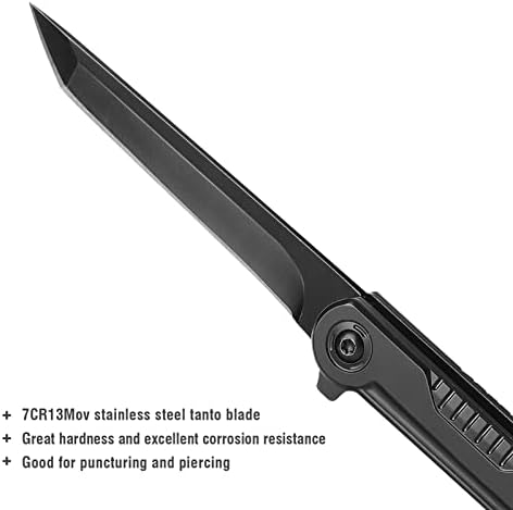 Tanto Blade: Featured great hardness and excellent corrosion resistance 7CR13Mov stainless steel sharp blade, this slim tanto knife is good for puncturing and piercing. It’s a nice edc knife with smooth action, solid blade and strudy frame.