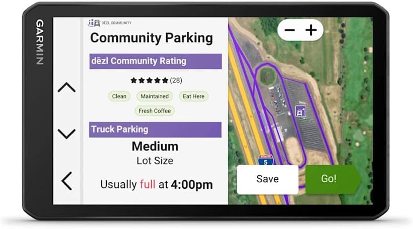 Expertly plan your arrivals with high-resolution aerial views of loading docks, truck entrances, and security gates, making complex deliveries easier. The Garmin dezl Cam OTR725 GPS Truck navigator community ratings feature lets you access real-time insights from fellow truck drivers on the best parking spots, loading docks, and other essential locations, streamlining your route and improving efficiency.