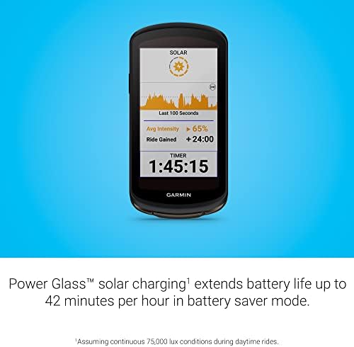 The Power Glass solar charging lens extends battery life, giving you up to 100 hours in battery saver mode or up to 45 hours in demanding use cases; during daytime rides, it adds up to 42 minutes per hour in battery saver mode and up to 20 minutes per hour in demanding use cases (assuming continuous 75,000 lux conditions during daytime riding)