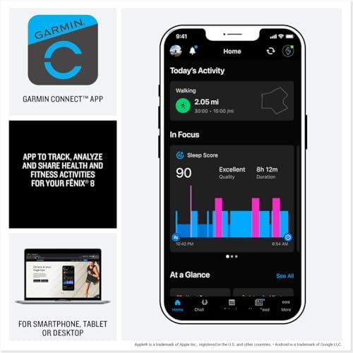 Be limitless. The fēnix® 8 multisport GPS smartwatch is built for serious athletes and outdoor adventurers who want to push beyond their limits. It features a 1.3” solar charged display with scratch-resistant sapphire lens, durable titanium bezel and powerful built-in LED flashlight for after-dark visibility. A built-in speaker and mic enable you to make and take calls from your wrist when your watch is paired to your smartphone. Power up your body’s performance, endurance and resistance to injury with targeted strength training plans and a full range of sport-specific workouts. Performance insights help manage your exertion and build stamina, while training readiness features show how much recovery time you need between workouts, based on 24/7 health and wellness monitoring of heart rate, respiration, stress, sleep and more (data presented is intended to be a close estimation of metrics tracked). Take to the trails with built-in ABC sensors and preloaded TopoActive maps. The dynamic round-trip routing feature helps simplify the planning of your runs or rides — letting you set your target distance and receive turn-by-turn directions that adjust to get you back to your start on schedule. Enjoy extended off-grid adventures with solar power providing up to 92 hours of battery life in GPS mode (assumes continuous use for entire period in 50,000 lux conditions). Plus, a 40-meter dive rating and leakproof metal buttons let you reach new depths of adventure. Additional features include music storage, Garmin Pay™ contactless payments (with a supported country and payment network), smart notifications (compatible smartphone required) and more.
