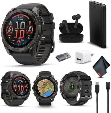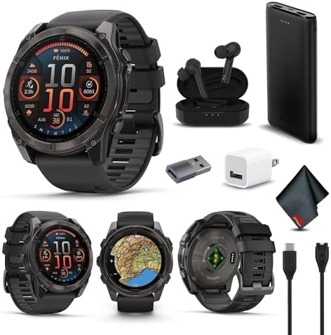 Bundle Includes: Garmin Fenix 8 51MM AMOLED Multisport GPS Smartwatch, Sapphire, Carbon Gray DLC Titanium with Black/Pebble Gray Silicone Band + USB type-c female adapter + USB Charging Adapter + 6Ave Microfiber Cleaning Cloth + P-Bank Battery + Air Pro TWS Truly Wireless EarBuds – (Color may vary)