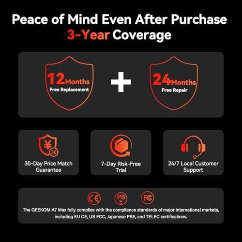 โ[ Upgraded Quality Assurance | Global Certification + 3 Years Warranty ] The GEEKOM A7 MAX mini PC comes pre-installed with Windows 11 Pro, ready for immediate use. While many brands only offer a one-year warranty, GEEKOM’s three-year coverage demonstrates confidence in our product materials, manufacturing processes, and relentless pursuit of quality and reliability. Certified with CE, FCC, CB, and CCC, it guarantees quality and security for enterprise deployments.