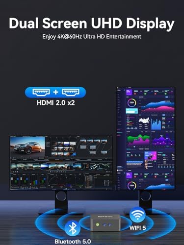 4K DUAL SCREEN DISPLAY – Mini desktop computer is equipped with upgraded Intel Graphics(max 1000MHz), supports 4K video playback and AV1 decoding, connect the pc with a projector as a home theatre, enjoy a variety of entertainments. Two HDMI 2.0 ports allows you to multi-task efficiently on two 4K@60Hz displays