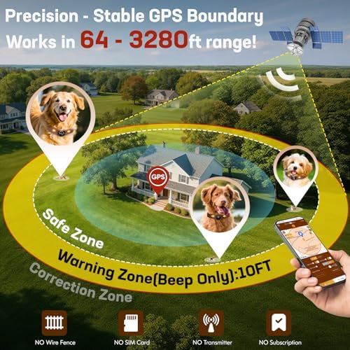 【Upgraded GPS Module & Stable Signal for Wide Boundary】 Built with anti-interference dual-core GPS chip, this dog boundary collar connects to 12+ satellites for fast positioning and low power consumption. It features 12 cute dog avatars on the screen and supports an adjustable wireless boundary from 64ft to 3280ft, minimizing signal interruptions to let small, medium and large dogs play freely outdoors without restrictions.