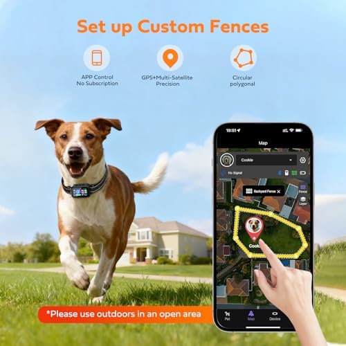 GPS Wireless Dog Fence with No Monthly Fee: Create circular or polygonal virtual fences using free App, adjustable range from 82 to 7000 feet (up to 3534 acres), no wires or subscription required. Supports real-time tracking within Bluetooth range ≤98 feet in open outdoor areas for strong GPS signal. Black collar with matte finish and adjustable strap.