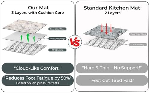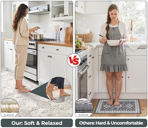 100% Thicker & Anti-Fatigue: Our kitchen carpet is crafted with premium polypropylene fabric for a luxuriously soft touch. Featuring a newly enhanced 8mm vacuum cotton padding – thicker than standard counterparts on the market – it delivers plush underfoot comfort, effectively alleviating foot fatigue during prolonged cooking sessions while cushioning joints from the strain of hard flooring surfaces.