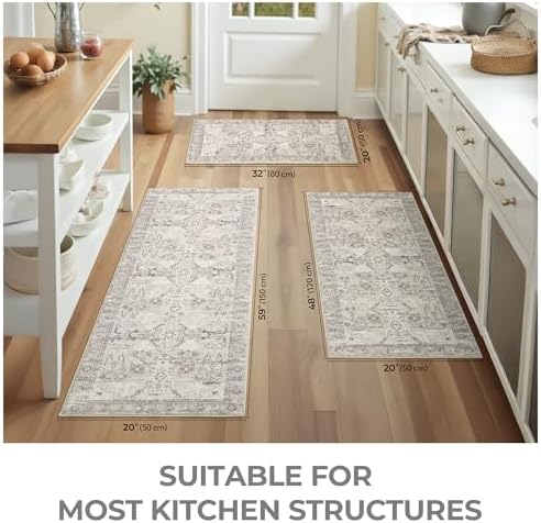 3 Piece Kitchen Rug Set: This Boho kitchen floor mat set includes three rugs with dimensions of 20″x32″ + 20″x48″ + 20″x59″. The varying sizes cater to different kitchen zones, suitable for placement in front of sinks, by stoves, along walkways, and other key areas. The overall beauty and coordination enhances the kitchen design aesthetic.