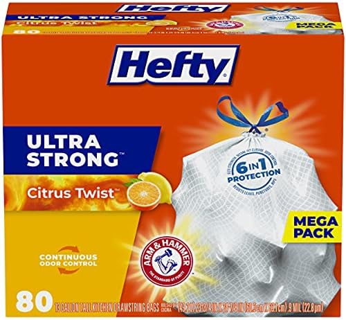 Trust Hefty Ultra Strong 13 Gallon Trash Bags to keep your kitchen waste contained—all the way from the can to the curb. Thanks to 6-in-1 Protection, these tall kitchen trash bags offer flexible strength, a secure closure, odor control technology, and resistance to leaks, punctures, and rips. The result is the highest protection you can get in flexible 13 gallon trash bags. Hefty’s stretchy strength means you don’t have to worry about unexpected bag breakage and inconvenient messes when you use these tall kitchen garbage bags. A break-resistant grip drawstring makes it easy to close the bag and cart it away without incident. As a bonus, these tall trash bags include Arm and Hammer odor control technology and a Citrus Twist scent to keep unpleasant smells at bay and keep your kitchen smelling fresh and clean. All Hefty trash bags are backed by a 100% satisfaction guarantee. **The ARM and HAMMER trademark is owned by Church and Dwight Co., Inc., and used by Reynolds Consumer Products LLC under license.