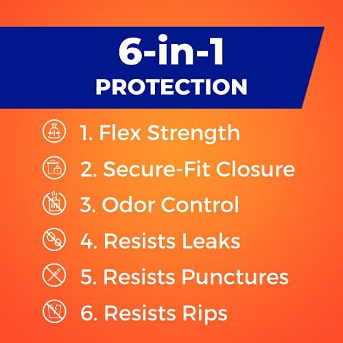 6-in-1 Protection: These Hefty 13 gallon trash bags offer a powerful combination of six features: flex strength, tough drawstring, odor control technology, and resistance to leaks, punctures, and rips