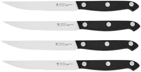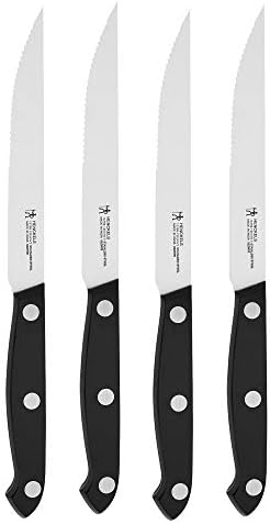 This HENCKELS Prime steak knife set features four knives that boast a classic design to fit any kitchen. These ultra-sharp knives are designed for cleanly slicing through pork chops, filet mignon, and chicken cutlets with ease, without tearing or shredding. Fabricated from durable, high-quality stainless steel, Prime’s single-piece, stamped blade construction is lighter than forged knives. Thanks to their handy micro-serrated edge, the blades never need to be sharpened. Enjoy tireless cutting with the ergonomic, triple-rivet handle that provides comfort and balance. And these dishwasher-safe knives are conveniently easy to clean. Set includes 4 x 4.5-inch steak knives.
