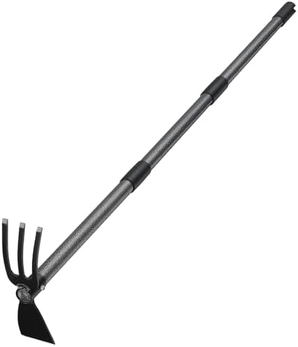2-in-1 Combo Garden Hoe: Double-sided means simply flip of the handle without switching tools. The garden hoe blade for digging out dirt or chopping up weed root, and tiller end with the 3 steel prongs for stirring up the dirt and weeding in small flower bed or garden. (NOT FOR HARD SOIL)