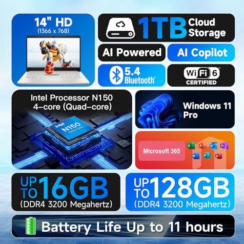🤖Powerful Intel Processor for Effortless Productivity: Experience smooth, responsive performance with the HP 14 laptop powered by the Intel Processor N150 (4 cores, 4 threads, up to 3.6GHz, 6MB cache). Perfect for work, web browsing, photo editing, and light video creation, this HP laptop ensures faster multitasking and quick access to apps. Integrated Intel Graphics deliver vivid, realistic visuals for creative applications and casual gaming.