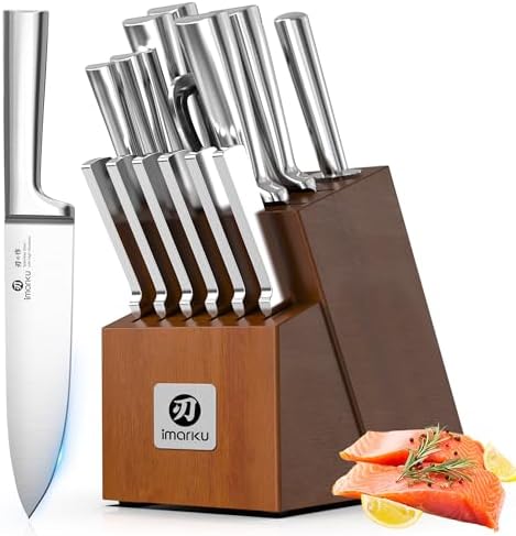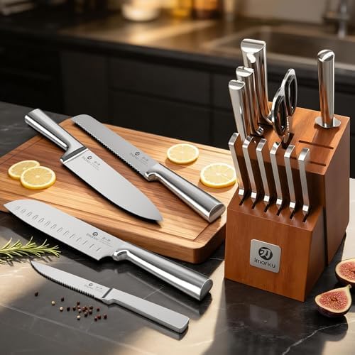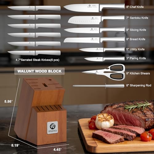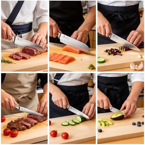 Complete 15-Piece Knife Set with Block for Every Task: This 15 piece knife set with block and sharpener includes essential tools for everyday cooking: chef knife, santoku knife, bread knife, slicing knife, utility knife, paring knife, kitchen shears, steak knives and knife sharpener. The durable wooden japanese knife set keeps your countertop organized while ensuring quick access during meal preparation.