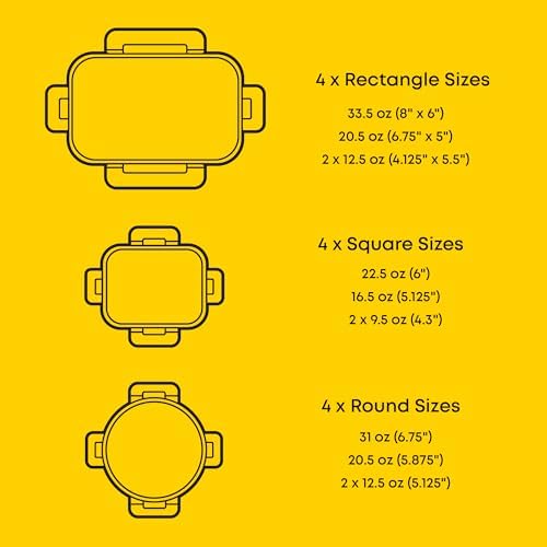12 SIZES FOR EVERY NEED: Our airtight food storage containers with lids set includes 4 rectangle containers 35oz (8x6in), 21oz (6.75x5in), 12oz (two 4.2×5.5in). 4 square containers 27oz (6in), 17.5oz (5.2in), 11oz (two 4.3in). 4 round containers 32oz (6.75in). 21oz (5.9in), 13.5oz (two 5.2in). Height ranges from 1.75-2.3 inches.