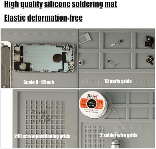 Keep your platform clean and tidy: Our welding pads are designed to enhance your maintenance by providing a built-in scale, 240 screw positions, 10 parts grids and 2 welding wire rosin boxes through simple design. These functions make it easy for you to classify IC chips, small parts and screws, improve your work efficiency and keep your maintenance platform clean. .