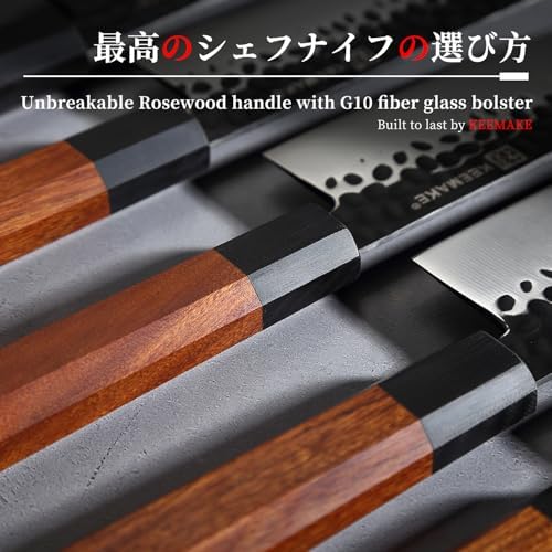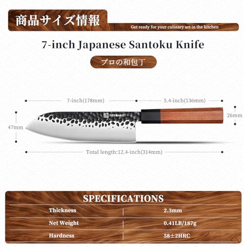 【PREMIUM MATERIAL】KEEMAKE KIKU series Japanese santoku knife is crafted out of premium Japanese 440C high carbon stainless steel with 58+ HRC and have the effect of increasing strength (sharpness and abrasion resistance) and sticky (hard to chip). Recommend Japanese 440c steel Japanese santoku knife because of their characteristics: ease of re-sharpening, good durability and rust resistance, and edge retention