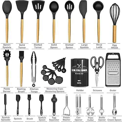 34PCS KITCHEN UTENSILS SET WITH HOLDER From the everyday kitchen spoons to the garlic crusher, This 34PCS kitchen utensils tools set included all the kitchen stuff you could possibly need to bring out your inner chef. This means you don’t have to spend extra money on repetitive utensil tools. This cooking utensils set includes a Slotted Spatula, Slotted Spoon, Turner, Pasta Server, Kitchen Tongs, Grater, Scissors, and so on. It is a great starter pack for a first apartment