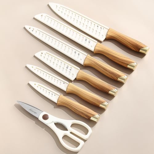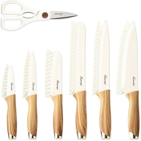 RAZOR-SHARP KNIFE SET: This kitchen knives set includes 8″ Chef Knife, 8″ Slicing Knife, 8″ Serrated Bread Knife,5″ Santoku Knife, 5″ Utility Knife, 3.5″ Paring Knife, Kitchen Shears and 6 pcs Blade Guards.