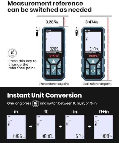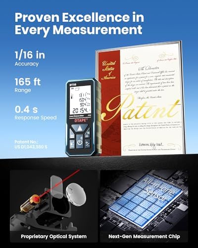 ▲Enhanced Accuracy: Equipped with DTAPE’s next-gen, self-developed DT Series high-precision chipset (Patent No.: US D1,043,380 S), this laser distance measuring tool delivers an impressive ±1/16 inch accuracy and measures distances up to 165 ft. Switch units seamlessly between in/ft/ft+in/m for maximum versatility.