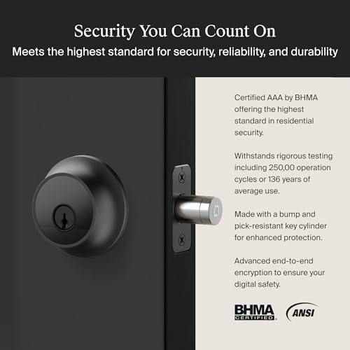 SECURITY YOU CAN COUNT ON: Certified AAA by BHMA and ANSI grade 1/A, representing the highest industry standards for security, durability, and finish. Includes bump-and pick-resistant cylinder and end-to-end encryption. Backed by 2-year limited warranty.