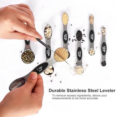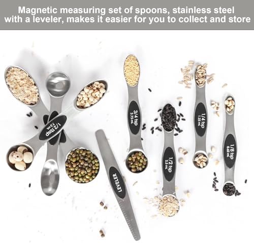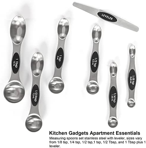 Kitchen Utensils Accurate Measuring Spoons Set: Designed with seven stainless steel double-headed spoons set and a leveler, the black plastic label on the magnetic measuring spoons set stainless steel with clear us standard measurement markings is useful for you to cook pastry food or spice jars. This tables gadgets new apartment essentials spoons set is available in various sizes, includes 1/8 tsp, 1/4 tsp,1/2 tsp, 1 tsp, 1/2 tbsp, 1 tbsp plus and 1 leveler.