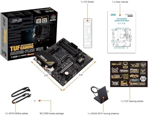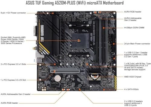 ASUS TUF Gaming A520M-PLUS WIFI Motherboard, mATX Form Factor, AMD AM4 socket, Support Dual Channel Memory DDR4 up to 128GB, 1 x M.2 Socket 3 with M Key, 4 x SATA 6Gb/s ports, USB 3.2 Gen 2 port(s)(1 x Type A), Windows 10 64-bit Support, Ready for AMD Ryzen 5000 Series/ 5000 G-Series/ 4000 G-Series/ 3000 Series/ 3000 G-Series Desktop
