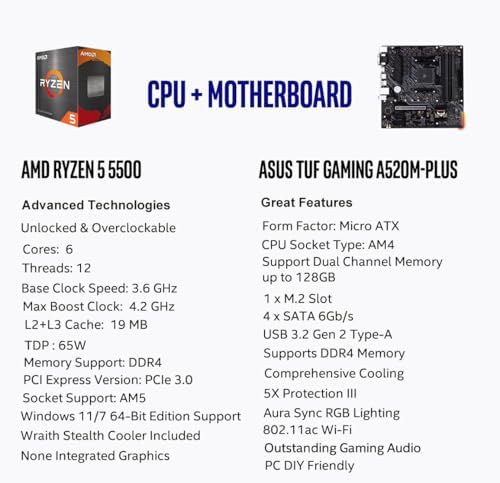 AMD Ryzen 5 5500 Desktop Processors, 6 Cores and 12 processing threads, ,4.2GHz Max Boost, TDP 65W, unlocked for overclocking, 19 MB cache, DDR4, Wraith Stealth Cooler Included, None Integrated Graphics