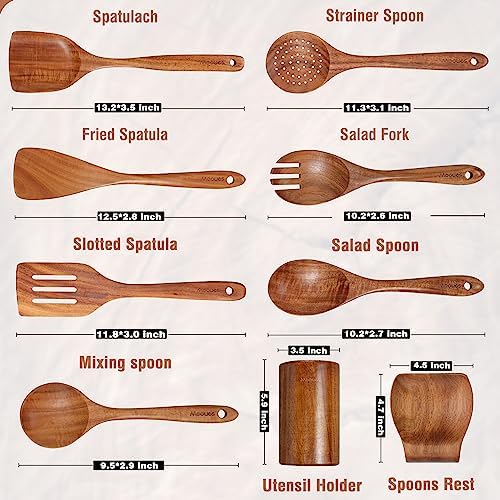 9-Piece Wooden Spoon Set: A complete wood kitchen utensils that features all the essential cooking tools including a flat spatula, fried spatula, slotted spatula, kitchen utensil holder, spoons rest, strainer spoon, salad fork, salad spoon, mixing spoon. Covers all your kitchen needs from stirring to cooking