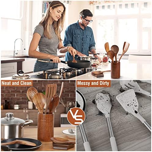 Natural Teak Wood: Our wood cooking utensils is made of natural solid teak, which is healthy and safe. Teak is densely grained, hard, and will not crack that it one of the most durable woods, stronger than silicone or bamboo. Wooden spoons are sanded by hand many times, and the surface is smooth will not hurt any cooking tools