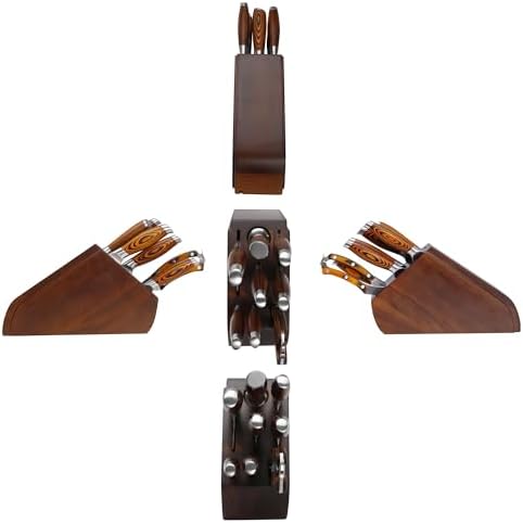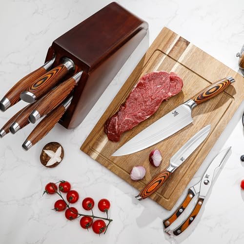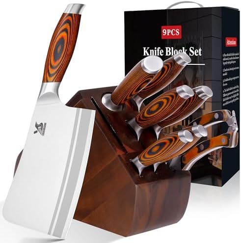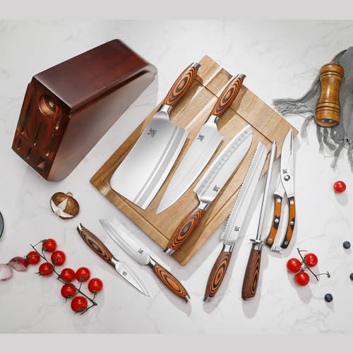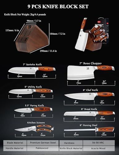 【Well-Designed Knife Set】Includes: 1*bone chopper, 1*chef knife, 1*bread knife, 1*santoku knife, 1*utility knife, 1*fruit knife, 1*kitchen shears, 1*Honing steel, 1*Knife Block. These blades will provide you with the perfect, clean separation you’ve been searching for bone chopping, slicing, precise peeling, filleting, skinning and trimming. It is essential for any serious chef.