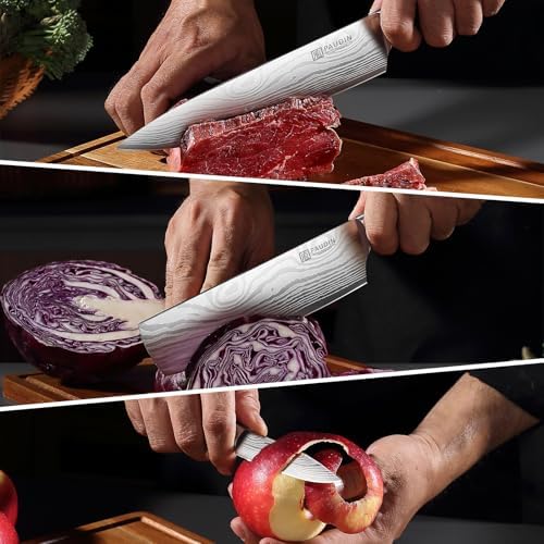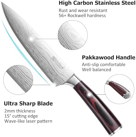 Ultra Sharp Blade: The blade thickness of this chef knife set is 2mm, with a 15 degree edge angle on two sides to ensure sharpness. Whether you are left-handed or right-handed, you can enjoy cooking with the knives! The special wave pattern blade (not real Damascus) is also particularly and striking!