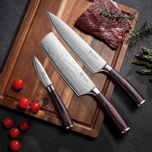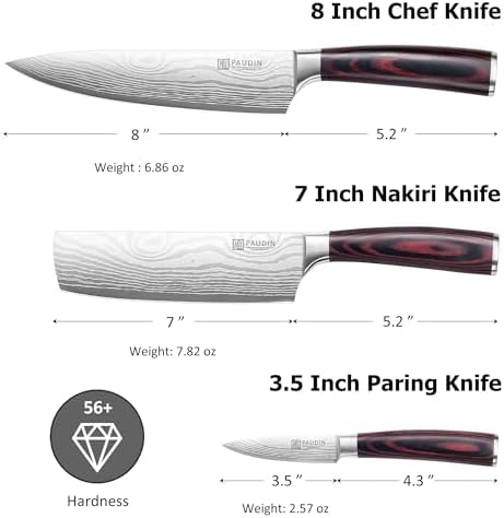 Professional Boxed Knife Set: Paudin team chooses the most popular and great knife set for you! The 3 Pieces of knives include an 8’’ chef’s knife, a 7’’ nakiri knife, and a 3.5’’ paring knife. These kitchen knives can easily handle your daily kitchen tasks of chopping, mincing, and dicing. This knife set is also suitable for home and professional use.