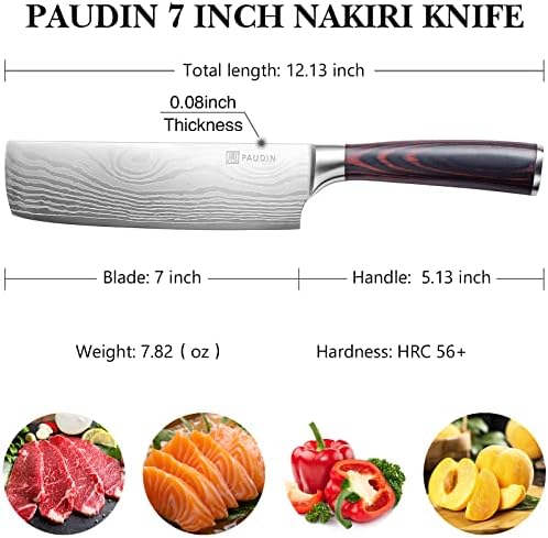 ALL-PURPOSE NAKIRI KNIFE: The classic 7 inch kitchen knife is flexible for all kinds of heavy duty preps, like slicing, dicing, chopping and mincing. A truly all-around cooking knife, is easy to re-sharpen, clean and maintain.