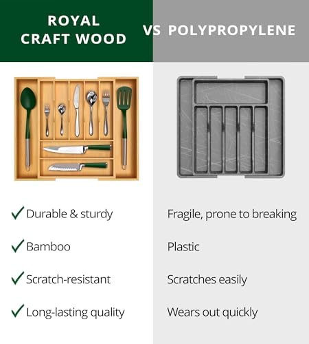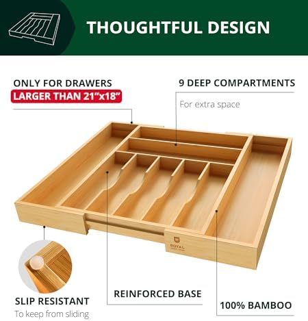 π πππππππ ππ π ππππππ ππππ πππ πππππππ ππππππ: Our cutlery organizer is not only great for storing flatware, but can also be used as a kitchen drawer organizer for large utensils such as spatulas, spoons, ladles, and more. Find all your kitchen gadgets in one spot, completely hassle free, thanks to the storage containerβs deep compartment walls. Take advantage of our beautiful bamboo organizers expandability and 9 main compartments