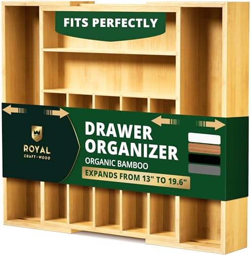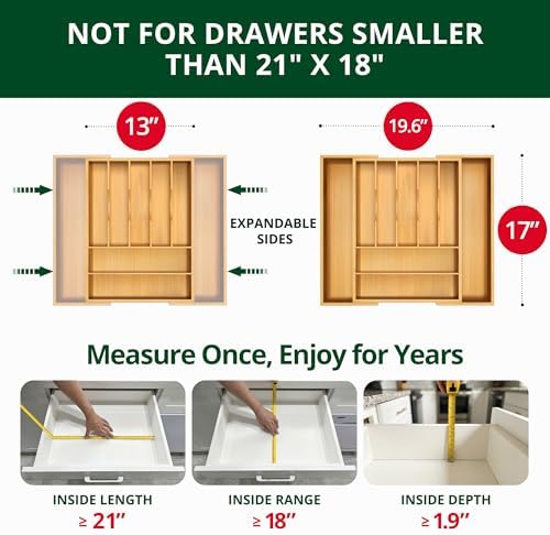 ππ ππππ ππππππππ πππππππ πππππππ: Our deep bamboo drawer organizer is ideal for saving kitchen storage space, thanks to its adjustable storage drawers that expand from 17βx13β to 17×19.6β wide with 1.9β deep slots. Easy to use and ideal for helping to maximize kitchen storage space, simply pull apart from the sides for additional storage space and a more secure fit for wider drawers. Different sized compartments allow for standard silverware and large utensil placement