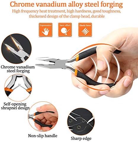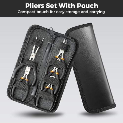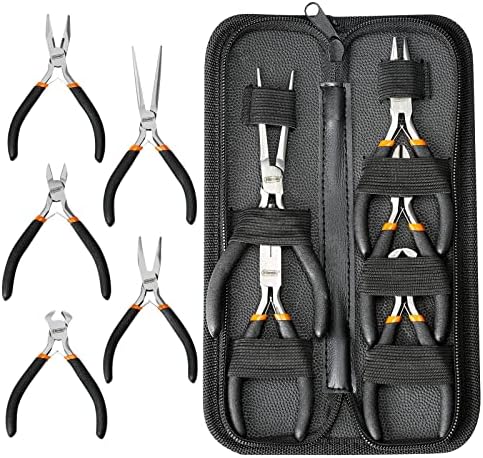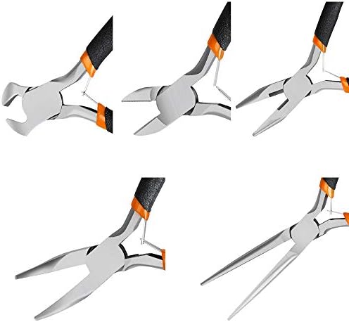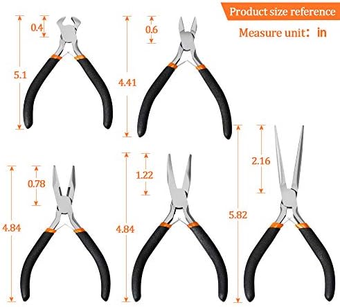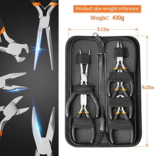 What You Will Get – 5 mini pliers for any job, Long nose plier 4-1/2″; Long needle nose plier 4-1/2″; Diagonal plier 4-1/2″; End cutting plier 4-1/2″; Nippers bent nose plier 4-1/2″. Each pliers comes with a different head so you can meet all your small craft and DIY needs from wire cutting, looping, gripping and shaping. All 5 in a PVC portable handbag.