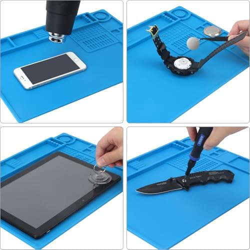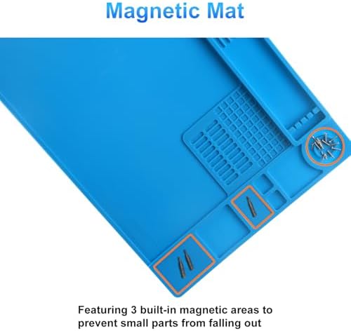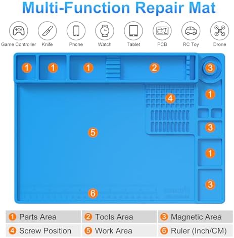 Wide Application: At 13.78 x 9.84 inches, this solder mat provides ample space for soldering and repairing various electronics, such as watch, iPhone, and RC drone. It’s also a practical gift for DIY enthusiasts, technicians, and professionals. The repair mat features 3 magnetic zones for metal components and screws, and non-magnetic zones to protect precision parts from magnetic interference