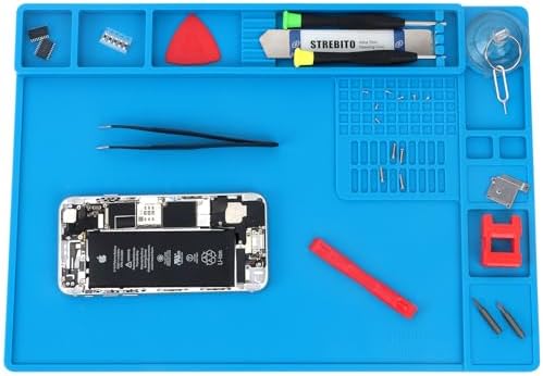 Organized & Efficient: The STREBITO soldering mat features 7 accessory zones, 1 tool zone, 3 magnetic areas, and 70 compartments for screws, small parts, and tools. This silicone soldering mat keeps your work bench tidy, preventing items from rolling or getting lost. Easy-access compartments save you time and make soldering and reassembly quick and hassle-free