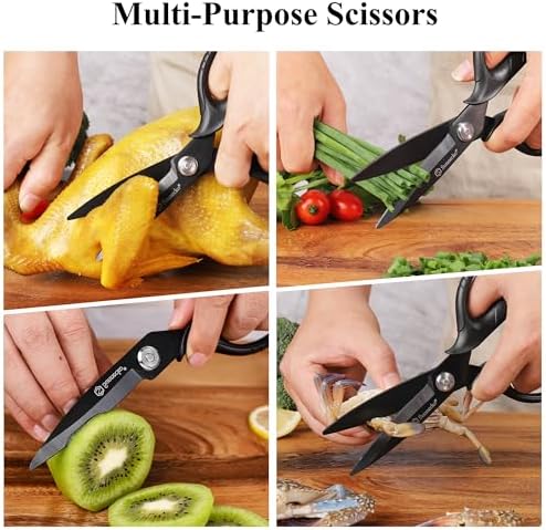 Kitchen Scissors All Purpose – The meat scissors can effortlessly tackle any challenge like cutting poultry, fish, and herbs. Each pair of meat cutting scissors comes with an elegant portable bag and packaging box, making for an ideal gift for Fathers’ day and Mothers’ day, birthday and housewarming.