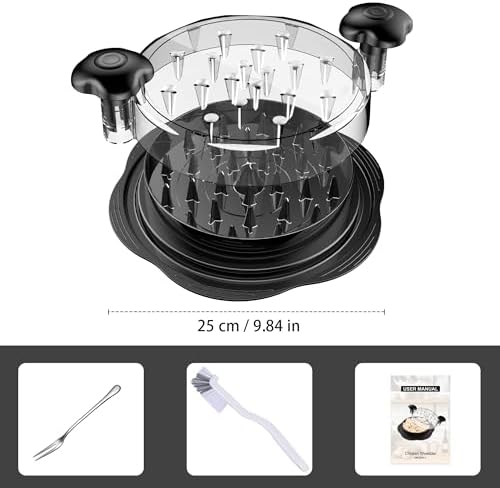 SHREDDED MEAT IN SECONDS: The meat machine builts-in plastic teeth that cover the whole area which can tightly clamp the food, the lid has extra spikes on the edge, which help meat gather the shredded meat in the middle, cutting it evenly. the tool is applied with an ergonomic handle and an anti-slip base, ensuring comfort and easy operation even during heavy use. These updated structure designs can make your cooking tasks more efficient